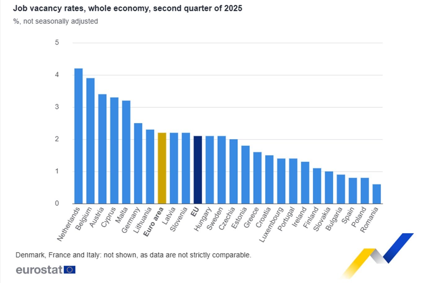 على مستوى الاتحاد الأوروبي، بلغ معدل الوظائف الشاغرة 2.1% في الربع الثاني من 2025، مسجلاً انخفاضًا من 2.2% في الربع الأول و2.4% في نفس الفترة من العام الماضي.
